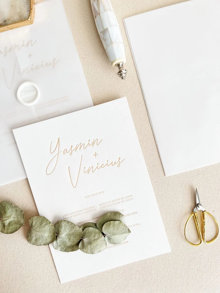 Agora que já entramos em alguns detalhes dos casamentos de luxo, vamos entender como tudo isso vai refletir na identidade visual e no convite! De modo geral, um convite de casamento luxuoso será desenvolvido com materiais premium, de alta qualidade, muitas vezes até mesmo artesanais e acabamentos bem exclusivos.